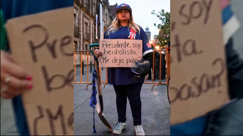 Con un cartel que dice «Presidente, soy beisbolista. ¿Me deja pasar?», Ceci Flores buscó llamar la atención del mandatario. Explicó que decidió cambiar su apariencia para intentar obtener una audiencia, ya que considera que el presidente atiende a los beisbolistas pero no a las madres buscadoras como ella.