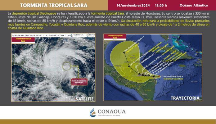 El Servicio Meteorológico Nacional (SMN) informó este jueves sobre la formación de la tormenta tropical “Sara” frente a las costas de Centroamérica, a 610 kilómetros al este-sureste de Puerto Costa Maya, Quintana Roo. El fenómeno meteorológico, que surgió inesperadamente en esta época del año, está previsto que toque tierra en Honduras esta noche.