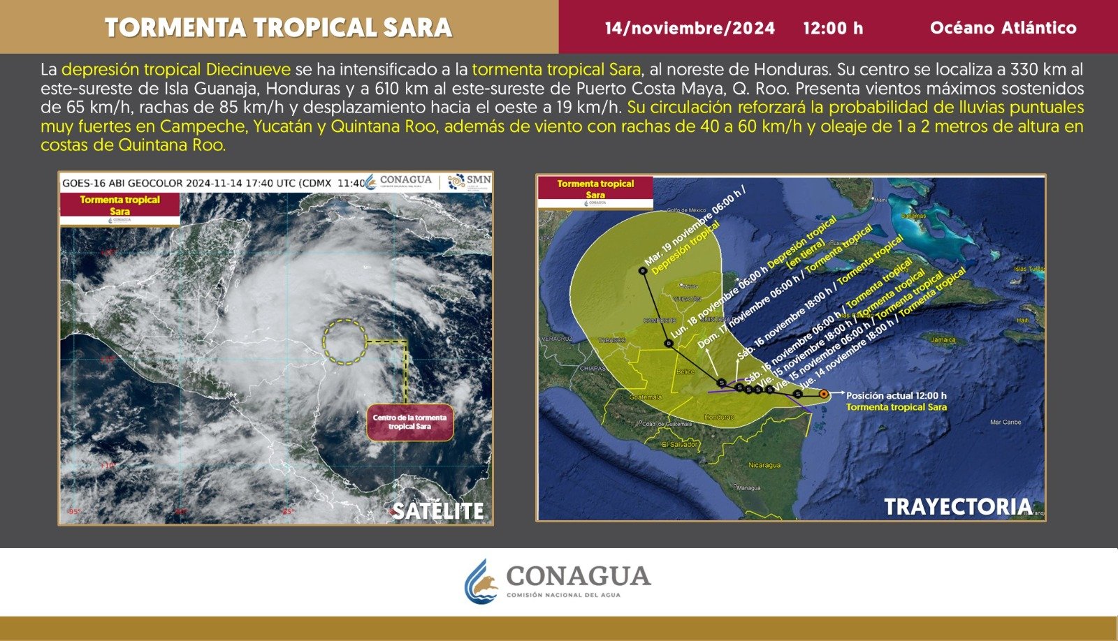 Según el último reporte del SMN, “Sara” se ubica a 330 kilómetros al este-sureste de Isla Guanaja, Honduras, con vientos sostenidos de 65 km/h y rachas de hasta 85 km/h, moviéndose hacia el oeste a una velocidad de 19 km/h. Se espera que, tras impactar Honduras, la tormenta avance hacia Belice el domingo y finalmente cruce Campeche como depresión tropical.