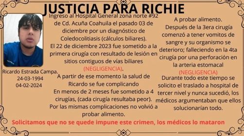 Ricardo ingresó al Hospital General Zona Norte #92 en Cd. Acuña, Coahuila desde los primeros días de Diciembre del 2023, a causa de un diagnostico por cálculos biliares (coledocolitiasis). El día 22 de Diciembre lo intervinieron quirúrgicamente lo que le provocó una lesión en sitios contiguos de vías biliares, a lo que demandan familiares de Ricardo como una total negligencia.