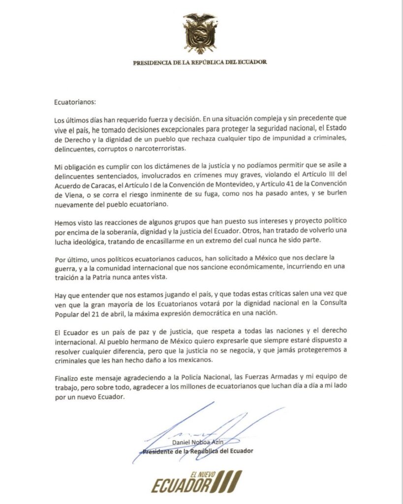 En un comunicado difundido en redes sociales, Noboa aseguró que tomó decisiones excepcionales para proteger la seguridad nacional y el Estado de Derecho del país.